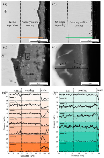 The cross-sectional microstructures of the K38G and N5 nanocrystalline coatings after oxidation for 100 h are shown in Figure 5. Oxide scales on the two nanocrystalline coatings were completely different, especially in thickness and composition. The oxide scale on the K38G nanocrystalline coating was about 8.59 μm thick, which was divided into two parts: the dark and grey parts, as shown in Figure 5a. The dark part of the oxide scale was near the K38G coating, and the grey part was near the atmosphere, as shown in Figure 5c. As shown in Table 3, the dark part was rich in Al, and should have been Al2O3, while the grey part of the oxide scale was rich in Ti, and should have been mainly made up of TiO2. Some pores on the oxide scale were detected, denoted by arrows in Figure 5c. Besides these, some white particles were observed. According to the EDS and XRD results, they should have been Ta2O5. Figure 5e shows the distribution of Ni, Co, Cr, Ta, Ti, Al, and O in the K38G coating and its oxide scale. Ni, Co, Cr, Ta, Ti, Al, and O were evenly distributed in the coating, whose contents were similar to that in the substrate alloy. No element interdiffusion occurred in the K38G substrate beneath the coating.