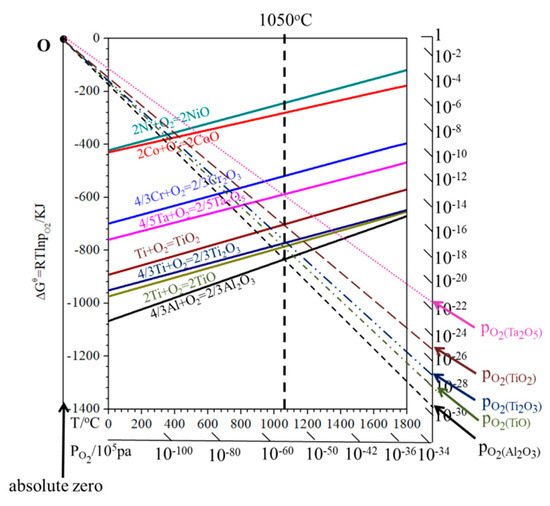 The oxide scale on the K38G nanocrystalline coating was composed of α-Al2O3, Ta2O5, TiO2, and Ni2CrO4; α-Al2O3 and Ta2O5 were also detected on the N5 nanocrystalline coating surface. All of these seriously deviated from the original design intention of the nanocrystalline coating, which was expected to form an Al2O3 scale. To solve the above problems, the Ellingham diagram [18] of Ni, Co, Cr, Ta, Ti, and Al is shown in Figure 6. It was inferred that ∆G of the Al2O3 was the lowest, followed by the oxides of Ti and Ta. For the N5 nanocrystalline coating, Al and Ta were the main γ′ elements. Combined with the Ellingham diagram and the contents of Al, the Al2O3 scale will be preferentially formed on the coating surface, which was already confirmed. At the same time, the columnar crystal at nano size in the coating was conducive to the rapid diffusion of Al, and promoted the formation of the protective Al2O3 scale. With the consumption of Al, its content decreased, while the content of Ta increased, and would be oxidized. Due to the fact that the PO2 of Ta2O5 is higher than that of Al2O3, the tantalum will move to the surface of the Al2O3 scale. However, due to the large size of the Ta2O5, it cannot move the surface [26,27,28,29,30,36,37,38,39,40].