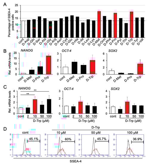 Screening process. (A) First screening by flow cytometry. Three candidate amino acids were selected (red columns): D-methionine (D-Met), D-proline (D-Pro), and D-tryptophan (D-Trp). The experiment was performed once. (B) Second screening by real-time RT-PCR. D-tryptophan (D-Trp) strongly enhanced the mRNA levels of stem cell markers, NANOG, OCT-4, and SOX-2. Results are representative of two independent experiments. (C,D) hBMSCs were treated with four different concentrations (2, 10, 50, and 100 μM) of D-Trp for 48 h, and 10 μM concentration induced the highest increase in gene expression levels of NANOG, OCT-4 and SOX2 (C) and the number of SSEA-4 positive cells (D). Results are representative of at least two independent experiments. (** p < 0.01, one-way ANOVA/Tukey).