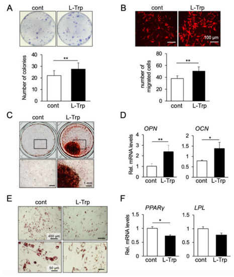 Effect of L-tryptophan on the stemness-related function and differentiation capability of hBMSCs in vitro. (A) CFU-F assay was performed using primary mBMSCs. The colony-forming potential was increased by the treatment of L-Trp. Data represent the means ± SD (n = 3). ** p < 0.01, unpaired t-test. (B) L-Trp induced higher migration ability compared to the control group. The images are representatives of three independent experiments. Graph shows the average number of migrated cells counted in four different pictures taken at each chamber. ** p < 0.01, unpaired t-test. Pre-treatment of L-Trp induced osteogenic differentiation of hBMSCs (C,D). L-Trp decreased the adipogenic ability of hBMSCs (E,F). * p < 0.05, ** p < 0.01, unpaired t-test. Images and graphs are representatives of at least three independent experiments.