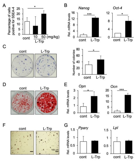 Effect of L-tryptophan on the stem cell phenotype of mBMSCs and trabecular bone in vivo. (A) FCM analysis of the percentage of mBMSCs positive for SSEA-4. mBMSCs from L-Trp (50 mg/kg)-treated mice showed a significantly higher number of SSEA-4 positive cells than the control group. * p < 0.05, one-way ANOVA/Turkey. (B) Gene expression levels of Nanog and Oct-4 in mBMSCs from 50 mg/kg L-Trp-treated mice was significantly higher than mBMSCs from the PBS-injected control group. Data represent the mean ± SD (n = 3). * p < 0.05, *** p < 0.001, unpaired t-test. (C) Treatment with L-Trp increased the colony-forming ability of mBMSCs. Data represent the mean ± SD (n = 3). * p < 0.05, unpaired t-test. (D,E) Differentiation ability. L-Trp induced stronger deposition of the calcified matrix as detected by Alizarin Red S staining (D) as well as an increase in the mRNA levels of Opn and Ocn on mBMSCs (E). No substantial change in Oil Red O staining (F) or gene expression levels of Ppar-γ or Lpl (G) could be observed upon L-Trp treatment. * p < 0.05, *** p < 0.001, unpaired test. Images and graphs are representative of at least three independent experiments.