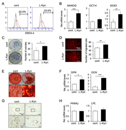 Previous investigations reported that 99% of L-tryptophan is catalyzed by the enzymes tryptophan 2,3 dioxygenase (TDO) and Indoleamine 2, 3-dioxygenase (IDO1) and subsequently metabolized through the L-kynurenine pathway [30,31]. Therefore, since L-kynurenine is the main metabolite of L-tryptophan, we evaluated the effects of L-kynurenine on the stem cell phenotype and differentiation ability of hBMSCs. As expected, in vitro analyses showed that L-kynurenine induced similar effects of those promoted by L-tryptophan, including an increase in the number of cells positive for SSEA-4 (Figure 4A), in gene expression levels of NANOG, SOX2, and OCT-4 (Figure 4B), as well as in the ability of mBMSCs to form colonies (Figure 4C) and to migrate (Figure 4D). Figure 4E shows that L-kynurenine also enhanced osteogenesis of hBMSCs as demonstrated by stronger staining of the calcified matrix with Alizarin Red S, and the increase in OPN and OCN mRNA levels. On the other hand, no significant changes in adipogenic differentiation of hBMSCs were observed upon L-kynurenine treatment, as analyzed by Oil Red O staining of oil droplets, and gene expression levels of PPARγ and LPL (Figure 4H).