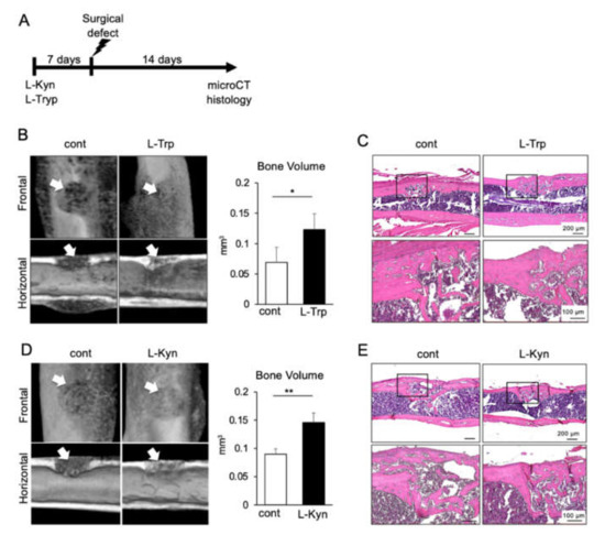We have previously demonstrated that during the inflammatory phase of wound healing, the inflammatory cytokine, tumor necrosis factor-α (TNF-α), enhanced the stem cell phenotype of MSCs [20]. Additionally, we also showed that MSCs intensively migrate to the wound site during the inflammatory phase of healing (initial two to three days post-trauma) to accelerate bone healing [20,32]. Based on these previous data, as well as on the fact that L-tryptophan and L-kynurenine enhanced the stemness and migration ability of BMSCs, we hypothesized that in vivo treatment with the two amino acids could also enhance bone healing. Therefore, we used a mouse model of femur surgical defect and administrated L-tryptophan or L-kynurenine (50 mg/kg/day) or PBS by intraperitoneal injections one week before the surgical defect was made, and subsequently for two weeks after the surgery (Figure 5A). As demonstrated by micro-CT analysis and quantitative measurements, we observed an enhanced bone regeneration both in L-tryptophan (Figure 5B) and L-kynurenine-treated groups (Figure 5D), compared to their respective PBS-injected control group. Moreover, histological sections further confirmed that L-tryptophan and L-kynurenine accelerated new bone formation (Figure 5C,E).