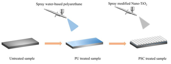 First, 2.5 g of hydrophobic nano-TiO2 dispersed in 50 mL of absolute ethanol and magnetically stirred for 30 min at ambient temperature. At the same time, 3 g of water-based polyurethane is uniformly dispersed into an appropriate amount of ethanol solution. Washed with anhydrous ethanol 7.62 cm × 2.54 cm slide glass and dried for future use. We used a spray gun to spray a layer of aqueous polyurethane dispersion on a glass slide. Subsequently, the nano-TiO2 dispersion was sprayed onto the surface of the uncured polyurethane, which was dried for 1 h in an oven at 80 °C in order to form a cured superhydrophobic coating (PSC). When used for asphalt mixture samples, we chose room temperature curing. The distance between the airbrush and substrates was about 20 cm. A schematic diagram of the preparation process is shown in Figure 1.