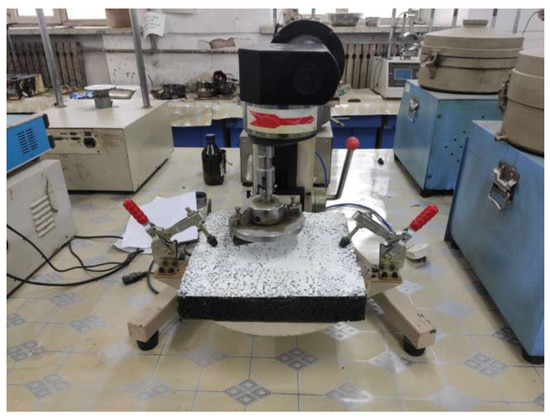 According to the standard T0752-2011 in the Chinese Standard Test Method of Bitumen and Bituminous Mixtures for Highway Engineering (JTG E20-2011) [29], wet track abrasion meter was used to simulate the consumption of the coating on the wheel rotation. The test is shown in Figure 3.