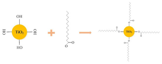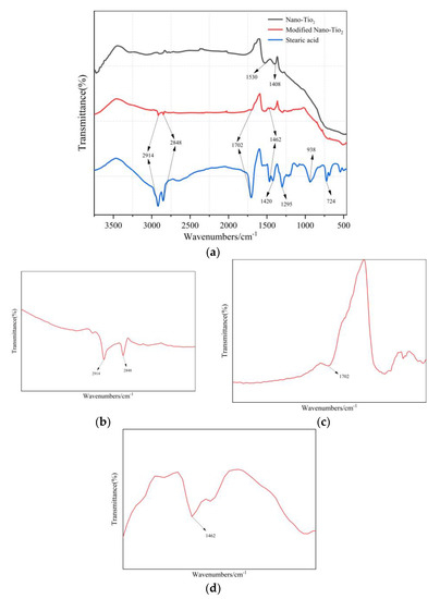 FT-IR spectrum test results are shown in Figure 5. Among them, Figure 5b shows that the peaks located at 2848 cm−1 and 2914 cm−1 in the IR spectrum, the analysis reason is caused by the symmetrical and antisymmetric stretching vibration of CH2 and CH3 [33,34]. The peak at 1702 cm−1 in Figure 5c is attributed to the stretching vibration of C=O in the COOH group [35]. The absorption peak at 1462 cm−1 corresponds to the deformation vibration of CH2 and CH3 groups (Figure 5d) [36]. These peaks were not found in the IR spectrum of nano-TiO2, indicating that stearic acid has successfully modified nano-TiO2, especially the introduction of CH3 and CH2 groups that can reduce its surface energy. Stearic acid is composed of non-polar hydrophobic alkane long chain and hydrophilic carboxyl groups. When stearic acid modifies nano-TiO2, the COOH in stearic acid reacts with the -OH group of TiO2 [37]. Their reaction mechanism is shown in Figure 6.