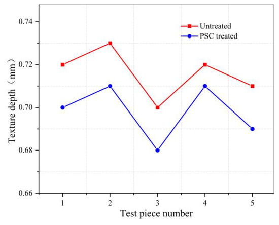 The sand was poured onto the surface of the asphalt mixture sample, we spread the sand into a circle with a push plate, and do not leave floating sand on the surface. The diameter of the two perpendicular directions of the circle formed by a steel ruler measure, and we take the average value. The texture depth (MTD) is calculated by Equation (3). After the test is completed, surface of the untreated sample is cleaned and PSC is sprayed to continue the test, the results are shown in Table 5 and Figure 9.