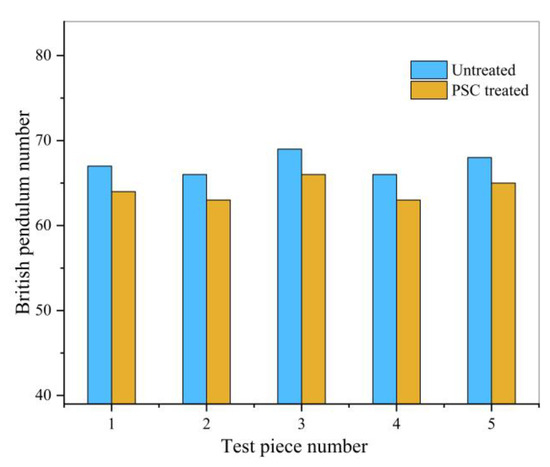 In the pendulum number test, a portable pendulum instrument was used to determine the friction coefficient of the asphalt mixture sample, measure the height of the backswing, and evaluate the friction resistance of the sample surface. The untreated and PSC treated samples were tested separately. The results are shown in Table 6 and Figure 10.