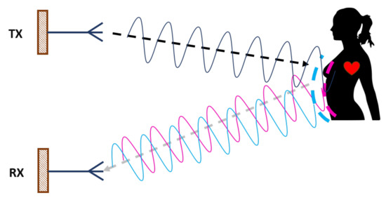 Generally, the bio-radar systems are composed of an antenna for transmission (TX), which focuses the energy towards the subject chest-wall, and another antenna for the reception (RX) to acquire its reflection. The received signal is a phase modulated version of the transmitted one. This modulation is triggered by the chest-wall motion that changes the travelled distance of the electromagnetic waves [1]. The working principle is depicted in Figure 1.