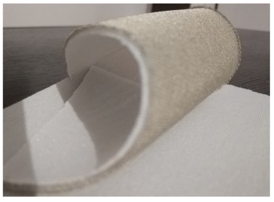 The SIGP is a weft-knitted spacer fabric, produced in a double circular machine, the V-LEC6BS Knitting Machine (Monarch Knitting Machinery Ltd., Leicester, UK), which has a routable needle cylinder and a needle dial, capable to produce a 3D weft-knit with differentiated faces. The SIGP was manufactured at Borgstena Textile Portugal Lda., following the manufacturing process of the Patent US 6779369 B2 [18]. In this work, the patented method was used in an innovative approach to manufacturing a weft-knitted fabric whose material faces have different physical properties, namely one conductive and one dielectric layer. Figure 4 presents the knitting structure and the Scanning Electronic Microscope (SEM) image of the transverse cross-section of the SIGP.
