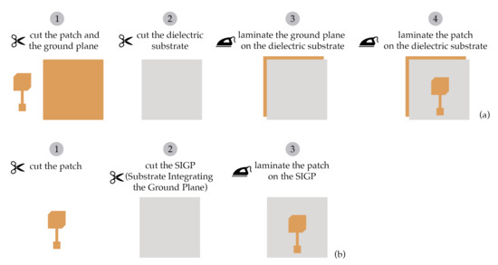 Comparison between the step-by-step of the laminating manufacturing technique, where (a) is the typical process used to assembly textile antennas, and (b) is the process to assemble textile antennas that uses Substrate Integrating the Ground Plane (SIGP) as dielectric substrate.
