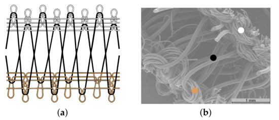 Scheme of the SIGP: (a) Weft-knitting structure diagram based on [18], where the white, black and brown yarns correspond to the dielectric, spacer and conductive yarns, respectively; (b) SEM image of SIGP, with 35X amplification.