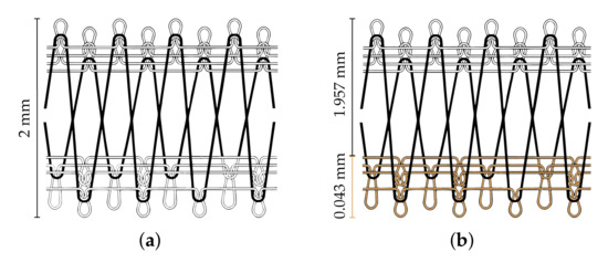 Difference of thickness between samples: (a) reference spacer knit and (b) SIGP. Where the white, black and brown yarns correspond to the dielectric, spacer and conductive yarns, respectively.