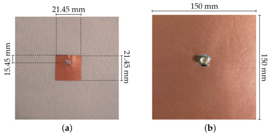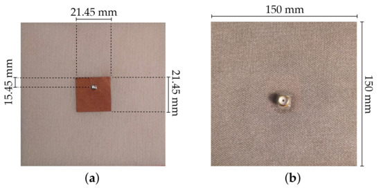 Thus, one microstrip patch antenna was designed to resonate at 5.8 GHz, using the SIGP substrate. The antenna was simulated in the CST Microwave Studio 2017 full-wave simulator, using the estimated values of and tan. These estimated values were based on a previous dielectric characterization of different types of 3D fabrics [26]. For manufacturing the patch, a Pure Copper Polyester Taffeta Fabric (PCPTF) (Less EMF Inc., Latham, NY, USA) was used, with 0.08 mm of thickness and conductivity equal to 62.5 kS/m. Figure 6 presents the design and the dimensions of the textile microstrip patch antenna.