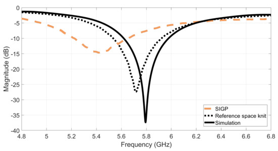 The SIGP antenna presents an acceptable performance within the evaluated bandwidth. However, a frequency deviation (5.42 GHz) can be observed when comparing its to the measured result of the antenna manufactured using the reference space knit (5.72 GHz), and to the simulated one (5.8 GHz). As textile materials present a quite narrow range of relative permittivity values, it is therefore their thickness, which values may present much larger variations, that will mainly determine the bandwidth as well the input impedance of the antenna and so its resonance frequency [27,28]. As one can see in Figure 5, the integration of the ground plane on the same sheet of the substrate, reduces the thickness of the dielectric substrate, thus changing the Q-factor of the antenna as described in [27,28]. Indeed, during the simulation process, a total thickness of the substrate equal to 2 mm was considered for both materials. However, the SIGP fabric have already included the ground plane, whose thickness is 0.043 mm, and thus its dielectric substrate is thinner than 2 mm (see Figure 5b). On the other hand, the control antenna was made using the reference spacer knit as dielectric substrate, whose thickness is 2 mm, and the ground plane was a separated layer, made using PCPTF, with thickness is equal to 0.08 mm.