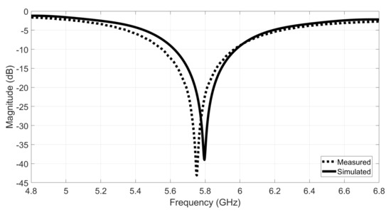 In order to guarantee the antenna’s parameters accuracy, a new SIGP antenna was simulated considering the new and built. Figure 9 shows the measured of the new manufactured SIGP antenna, where it is possible to verify that despite a small frequency deviation (5.75 GHz) the measured results are closed to the simulated ones. Assuming the as the real value of the substrate, one may estimate the conductivity of the ground plane of SIGP equals to 52 kS/m, which validates the results measured in the previous subsection.