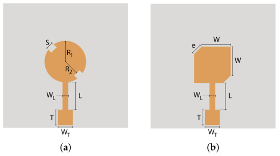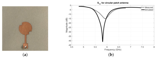 Left-hand circularly polarized (LHCP) antennas made using conventional substrate for 5.8 GHz: (a) circular patch antenna [29] and (b) squared patch antenna.