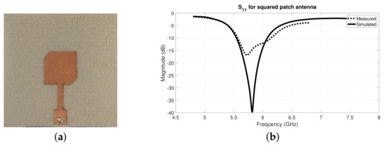 Through the analysis of the graphs from Figure 14b and Figure 12b, for the squared and circular patch respectively, it is possible to observe that the measured results are slightly shifted in frequency, in relation to the simulated ones. Nonetheless, acceptable values were obtained for 5.8 GHz, namely −15.15 dB for the squared patch and −12.43 dB for the circular patch. These antennas have several losses on their efficiency since textile substrate material is heterogeneous and highly porous, hence small deviation in the measured results were expected.