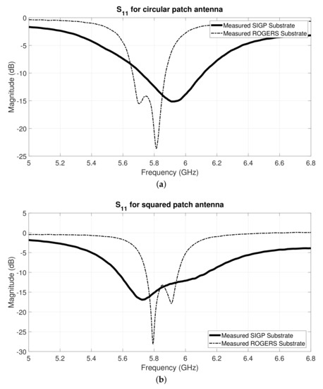 LHCP antennas made using SIGP for 5.8 GHz: (a) circular patch antenna and (b) squared patch antenna.