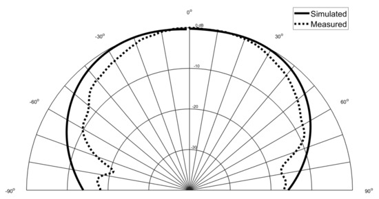Figure 15 and Figure 16. The radiation pattern was measured inside an anechoic chamber and the Phi = was the selected plane. It is possible to observe that once again the achieved results are in agreement with the simulated ones.