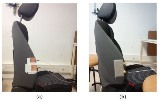 A preliminary test was carried out to verify if it was possible to acquire respiratory signals using textile antennas located in the side lumbar support. For this purpose, the respiratory signal of one subject was captured using both textile antennas and conventional substrate antennas, and their performances were compared. Figure 17 illustrates the position of the antennas in the car seat to acquire the respiratory signs.