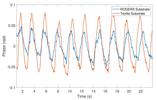 Comparison of the respiratory signals acquired using conventional and textile substrate antennas.