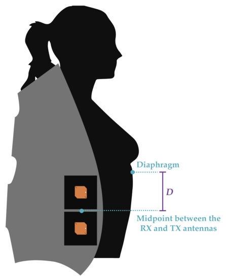 As physical parameters, the height and chest-wall width of each subject were considered, as well as the distance D. As one can see on Figure 19, the D is the distance between the diaphragm and the midpoint between the RX and TX antennas. The distance D is the most critical parameter since it can vary largely regardless of the subject’s height. Furthermore, this measure shows which expansion is the radar evaluating, which can vary between the belly motion or the chest-wall motion. For people with larger chest cavities, the radar could also measure the back motion, rather than the chest-wall.