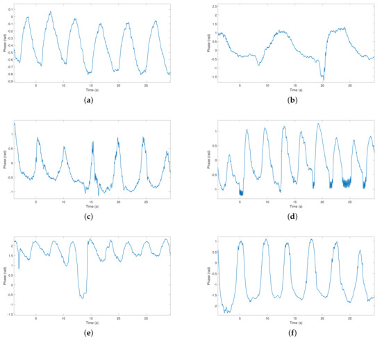 Respiratory signals of six subjects detected using textile antennas: (a) subject 1, (b) subject 2, (c) subject 3, (d) subject 4, (e) subject 5, (f) subject 6.