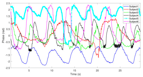 As one can see in Figure 20, it is possible to detect the respiratory signals of all subjects regardless of their physical structure or D value, which means that the signal can be acquired even if the detection points are not optimal. Since the signals were captured at the same time interval (30 s), it is possible to distinguish diverse characteristics among the detected signals, such as the respiratory rate. For example, the signal from subject 2 has a low respiratory rate, and subject 4 breathes at a higher rate. Other breathing patterns can also be identified, for example, subject 5 had laughed after 15 s of the experiment, which is represented by a sudden slope on the waveform.