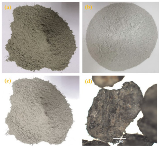 The physical appearance of (a) cement, (b) silica fume (SF), and (c) iron tailing powder (ITP), and (d) morphology of the ITP.