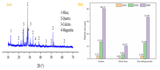 Portland cement (P·O 42.5), silica fume (SF), and iron tailing powder (ITP) was used in this study, as presented in Figure 1a–c. The physical properties of the cement (Table 1) were conforming to the Chinese National Standards GB 175-2007 [21]. The SF had moisture of 0.58%, a density of 2.21 g/cm3, and loss on ignition of 2.86%. The ITP was obtained from iron tailings after grinding for 45 min [22], it had a specific surface area of 580 m2/kg, a cumulative volume under 10 μm of 58.32%, and a density of 2.72 g/cm3 respectively. The morphology of the ITP was presented in Figure 1d shows that there were plenty of fine particles with irregular shapes. The XRD patterns of the ITP was provided in Figure 2a shows that it had an abundant calcium phase. Figure 2b shows the particle size distribution of the cementitious materials, it is clear that ITP had the lowest medium particle size (D50), which indicates that ITP had the finest particle size among raw materials. This means that the concrete containing ITP had particle dense packing, which helps the mechanical properties development of concrete [23]. Table 2 presents the chemical composition of cementitious materials by X-Ray Fluorescence (XRF9, Beijing Hongchangxin Technology Co., Ltd., Beijing, China).