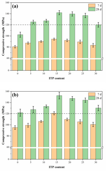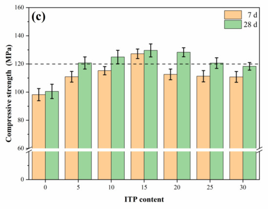 Figure 3b shows that the warm-water curing can both significantly improve their early-age and later-age compressive strength, compared with the samples without ITP. For example, the compressive strength of the specimens with 15% ITP dramatically increased by 26.9% (7 days) and 25.2% (28 days), respectively. That is expected because of the advanced hydration of cement when the samples are immersed in warm water. Sufficient moisture and high-temperature help to hydration of cement, which resulted in a denser microstructure (will be discussed in Section 3.5).
