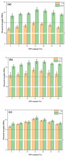 The specimens with 15% ITP obtained the highest flexural strength (14.7 MPa for 7 days and 21.3 MPa for 28 days) under standard curing (Figure 4). Moreover, the flexural strength of the sample C70ITP30 slightly decreased by 5.0% (7 days) and 3.3% (28 days), respectively, compared with the sample C100ITP0 under standard curing. This further confirmed that there existed an optimum ITP content (~15%) for improving the strength of concrete. Similar conclusions have been illustrated by other reports [32].