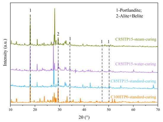 The diffraction peaks of portlandite (CH) in sample C85ITP15 was weaker than that of the reference sample (C100ITP0) under standard curing (Figure 5). This was mainly due to replacing a portion of cement with ITP diminishes the diffraction peak of portlandite. Weaker diffraction peaks of alite (C2S) and belite (C3S) were observed in samples C85ITP15. This observation confirmed that adding ITP promoted the hydration of alite and belite and helped to the formation of more hydration products [33]. These results are following the findings of Han et al. [16]. The peaks of alite and belite in C85ITP15 under standard curing are weaker than that of samples under two other curing regimes. This result confirmed that warm-water curing and steam curing accelerate the hydration of cement, help to form hydration products and improve the early-age strength of concrete. It agrees well with the above mechanical strength test results (Figure 3 and Figure 4).