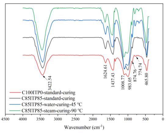 Additionally, the absorption peak at 1437.43 cm−1 was associated with asymmetric stretching vibration of C-O in calcite [16], the presence of calcite could be attributed to the carbonation of the cement paste during sample preparation [16]. This absorption peak in C85ITP15 under steam curing was considerably stronger than that of the sample under the two other curing regimes. The absorption band of S-O at 1008.77 cm−1 corresponded to Si-O stretching vibrations of Si-O tetrahedron [37], which indicates that the formation of the C-S-H gel [38]. The absorption peak at 983.05 cm−1 corresponded to the stretch vibration of Si-O also confirmed that the formation of C-S-H gel [16]. Notable that, the absorption peak of S-O at 1008.77 cm−1 in C85ITP15 was stronger than C100ITP0, which indicates that adding ITP resulted in the formation of a larger amount of C-S-H gel. Moreover, warm-water curing and steam curing regimes further increased the quantity of C-S-H gel in C85ITP15. It agrees well with the above XRD analysis (Figure 5). The absorption peak at 874.46 cm−1 related to the asymmetric stretching vibration of Al-OH in AFt [37]. It can be observed that the absorption peak around 874.46 cm−1 in C85ITP15 under steam curing was slightly stronger than that of the samples under standard curing at 7 days. This indicates that steam curing was more effective than standard curing in improving the early-age strength of concrete.