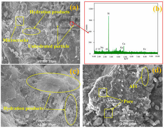 The microstructure of concrete containing different contents of ITP is presented in Figure 7, showing that there is a large number of cement hydrates and few voids. Furthermore, some unhydrated particles can be found in sample C100IP0 (Figure 7a). It can be inferred that the unhydrated particles are cement clinker through EDS analysis (Figure 7b). The sample C85ITP15 appeared a remarkably dense microstructure, there are a large number of clustered and needle-like hydration products (Figure 7c). Furthermore, the surface of the ITP particle is not smooth, and which is helpful links with the cement hydrates. Therefore, adding 15% ITP optimizes the pore size of the specimen and helps to improve their strength. This result is consistent with the above-discussed results (see Section 3.1). However, the microstructure of concrete with 30% ITP was loose and porous (Figure 7d). The fine ITP particles have a high specific surface area that can adsorb a lot of free water, increasing the amount of unhydrated cement. Moreover, the chemical reactivity of ITP was lower than that of the cement, the addition of overdosage of ITP (30%) decreased the number of hydration products.