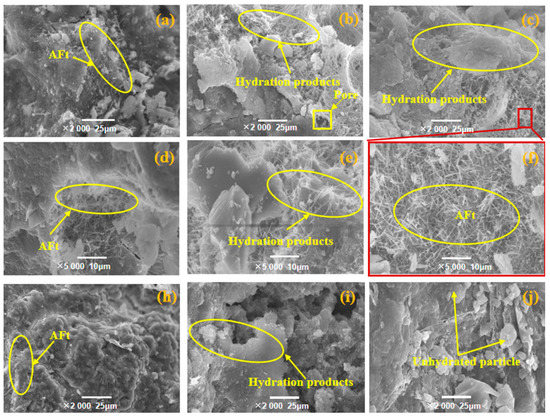 The microstructure of the samples C85IP15 under warm-water curing (Figure 8b) and steam curing (Figure 8c) had more hydration products and denser structure, compared with that of the sample under standard curing at 7 days (Figure 8a). This was attributed to the reactivity of ITP, that is greatly stimulated under the steam curing regime [1]. Additionally, the hydration reaction of the cement is accelerated at elevated temperature [8], which makes the structure denser and improves the strength of concretes (see Section 3.1). Upon further amplification of the acicular hydration products that exist in C85IP15, there are a lot of cluster structures and some acicular hydration products even formed interpenetrating networks (Figure 8f). The ITP has reactivity after grinding, which has the potential to react under the stimulation of CH and gypsum [17]. Moreover, the unreacted particles form a good grade and contribute to the dense structure [18], which provides excellent strength and helps to improve the concrete strength. Thus, the concrete incorporating 15% ITP under steaming curing at 45 °C obtained the highest early-age compressive strength (Figure 3a). Whereas, there are a large number of unhydrated cement particles that could be observed in the sample C85ITP15 at 28 days (Figure 8h). Thus, the steam curing at 90 °C is detrimental to the microstructure and the later-age strength formation of the concrete, compared with the standard curing (Figure 8i) and warm-water curing (Figure 8j).