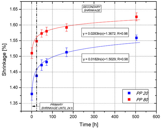 The changes in the shrinkage value depending on the conditioning time are logarithmic for both PP20 and PP80 samples. The trend line equations are presented in Figure 2. The obtained results confirm that the semi-crystalline polymeric products formed at higher mold temperature are characterized by a higher value of primary shrinkage, which took place in the injection mold, as well as in the first hours after sample preparation. In industrial practice, a high value of primary shrinkage of injection moldings is undesirable, however, it can be controlled by the settings of the parameters of the injection process, for example by extending the duration of the holding phase. However, the samples produced at a high temperature of the injection mold are characterized by a lower value of secondary shrinkage, i.e., a change in the dimensions of the samples, determined in this case from 24 h of conditioning. The phenomenon of secondary shrinkage is not only undesirable, but also uncontrolled, which may result in some difficulties in maintaining the dimensional accuracy of polypropylene-molded parts during their usage.