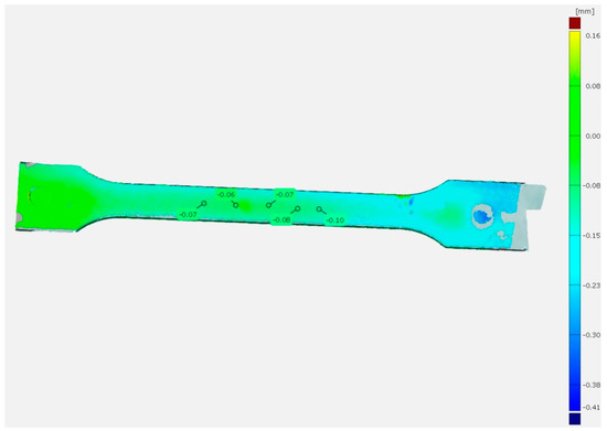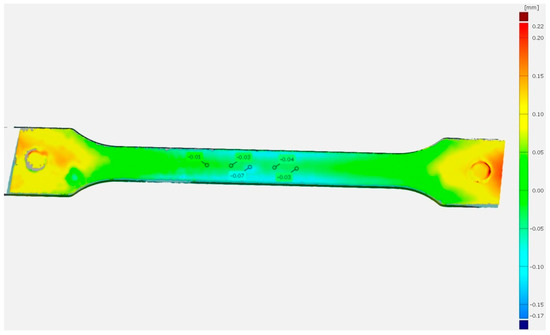The temperature value of the injection mold also influenced other dimensions of the test samples. Using a 3D optical scanner, the deviations from the reference surface were observed, particularly, the difference in the depth of sink marks on the surface of the samples (Δh). The PP80 samples after 1 h of conditioning revealed a superior depth of sink marks compared to the PP20 samples after the same conditioning time. This is confirmed by the blue areas visible on the comparison of the scanned PP80 sample dot grid with the reference model (Figure 3), which was the scanned PP20 sample grid. The mean depth of sink mark in the measuring section between the two samples was about 0.04 mm.