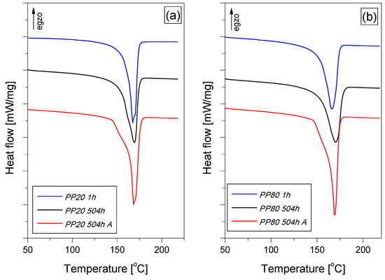 The structural changes taking place in the polymer are also confirmed by the results of calorimetric measurements. Figure 5a,b show the DSC melting curves recorded during the heating of PP samples conditioned for 1 h, 504 h and samples after annealing. The course of the DSC melting curves indicates that PP in moldings is characterized by a α-type crystal structure [31], with the values of the melting point in the range of 167 °C to 171 °C. Therefore, for the evaluation of the crystallinity of the samples, the value of 148 J/g was adopted as the enthalpy of melting α-PP with a 100% degree of crystallinity [35]. The value of melting enthalpy of PP20 samples increased from 91.39 J/g (after 1 h of conditioning) to 94.58 J/g (504 h of conditioning). The increase in the value of the melting enthalpy indicates an increase in the mass fraction of the crystalline phase in the structure. During the conditioning of the samples at a higher temperature than the glass transition temperature, the amorphous phase slowly transformed into the crystalline phase, which resulted in an increase in the degree of crystallinity by 2.2%. In the case of the PP80 samples, after the same period of time, an increase in the degree of crystallinity by 0.9% was observed. The annealing of the conditioned samples resulted in a further increase in the sample’s melting enthalpy, which corresponded to an increase in the degree of crystallinity to the values of 73.6% (PP20) and 76.2% (PP80), respectively. The observed values of melting enthalpy are slightly higher than the values determined by Dudić [8] for annealed samples that were not conditioned before. Moreover, the recorded course of the DSC melting curves of the annealed PP samples may indicate that not only quantitative changes (increase in the degree of crystallinity) but also morphological changes occurred in the crystalline structure of the material. It may be assumed that the observed total energy effect of melting of the annealed PP20 and PP80 samples consists of at least two overlapping transformations. This is indicated, inter alia, by the inflection of the melting curves at a temperature of about 163 °C.