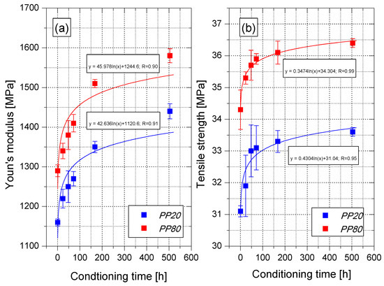 Figure 6. Changes of the E modulus (a) and tensile strength (b) of PP samples in the function of conditioning time.