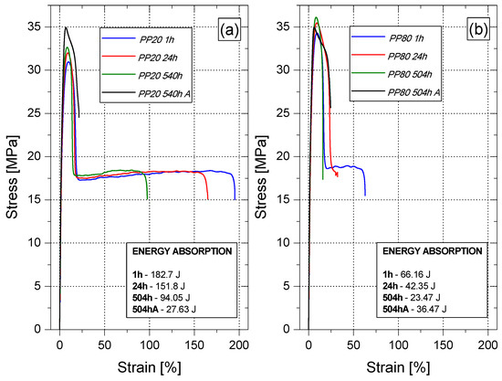 Moreover, on the basis of the analysis of the stress–strain relationship, it can be concluded that PP80 samples are characterized by significantly lower values of elongation at break (εb) in comparison with the PP20 samples. The value of the elongation at break of PP samples after 1 h of conditioning reached the value of 176% (PP20) and 60.5% (PP80), respectively, as shown in Figure 8a. This difference results from the lower content of the amorphous phase in the samples slowly cooled in the injection mold, which is characterized by a greater elasticity compared to the crystalline phase. As a result of the secondary crystallization taking place during the conditioning, the value of εb gradually decreased and after 504 h from removing the moldings from the injection mold, it reached the value of 67.6% for PP20 and 16.9% for the samples injected into the mold at a temperature of 80 °C. Changes in the values of strain at break indicate an increase in brittleness of PP samples with the passage of their conditioning time. This is also confirmed by the values of the energy that were absorbed until their destruction during static tension (Figure 7a,b). For PP20 samples, the absorbed energy value decreased from approximately 183 J for the sample tested 1 h after injection to 94 J after 504 h of conditioning. The brittleness of the samples produced at the higher temperature of the injection mold was increased significantly. Immediately, after 1 h of conditioning, the registered value of absorbed energy was 66 J. After 504 h of conditioning; this value dropped to about 23 J and was comparable to the value determined for the PP20 sample after annealing.
