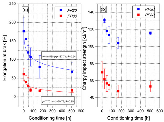 Figure 8. Elongation at break (a) and Charpy impact strength (b) of PP samples in the function of conditioning time.