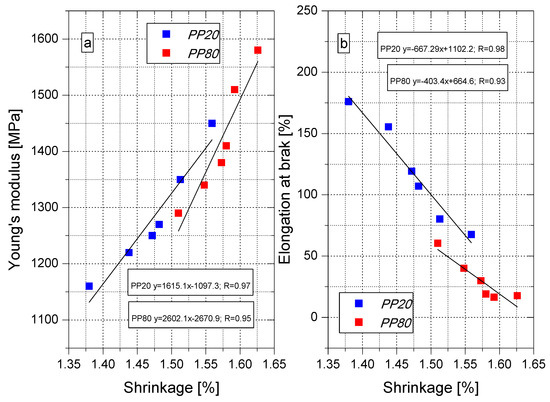 Figure 9. Correlation between young’s modulus (a), elongation (b) at break and shrinkage.