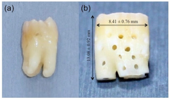 Healthy non-functional extracted teeth were used to prepare scaffolds. Twenty patients were informed of the study objectives and agreed to participate for tooth extraction by an informed consent. All patients were healthy and free of systemic diseases. The teeth were donated at the Department of Oral and Maxillofacial Surgery for the research approved by the review board of the Dental Faculty of Health Sciences University of Hokkaido. Following extractions, the teeth were stored in liquid nitrogen at −152 °C for about two weeks before surgery. After soft tissue dissection and vigorous washing with distilled water (DW), the enamel and pulps were removed with a tapered fissure bur (Mani®, DIA-BURS TF-11, Tochigi, Japan). A 1 mm area was cut from the apical portion using a diamond disk bur (Horico®, DIAMANT, Berlin, Germany). To create an optimal pore size for bone ingrowth, a small round bur (Mani®, DIA-BURS BR-45, Tochigi, Japan) was used to fabricate 1 mm hole, similar to in our previous study [32]. Thirty perforations were uniformly distributed to the body of the modified tooth followed by supersonic demineralization (Powersonic 603®, Hwashin Tech. Co., Ltd., Seoul, Korea) in 5 L of 0.34 N HNO3 solutions at 100 W and 60 kHz for 30 min. The liquid temperature of the sample gradually increased with an increasing supersonic time up to 30 min, but they were maintained at less than 315 K to avoid denaturing proteins, as previously reported [33]. Finally, we used an extensive rinse with DW to prepare the PR-DDM. A total of nine teeth (n =9) were transformed into the PR-DDM, and the average length and width were calculated as 13.08 ± 0.92 mm and 8.41 ± 0.76 mm (Figure 1).