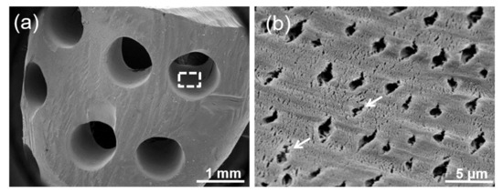 The SEM of PR-DDM exhibited a homogenous dentin surface with symmetrical artificial macro-pores (1 mm in diameter) (Figure 3a). A higher magnification image of the custom-made macro-pore region clearly revealed well-exposed tube-type pores, which are referred to as dentinal tubules, with dentinal hole diameters at approximately 1–2 μm on the dense dentinal collagen matrix surface (Figure 3b). Several micro-cracks due to the supersonic demineralization were also observed in the artificial macro-pore region (Figure 3b).