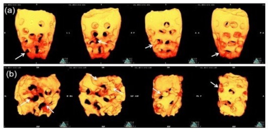 Three-dimensional-volume rendering images of PR-DDM. (a) Loss of custom-made perforations (white arrows) at 2 months, (b) Disappearance of perforations along with parts of dentinal wall (white arrows) at 4 months confirmed higher scaffold bio-absorption compared to 2 months.