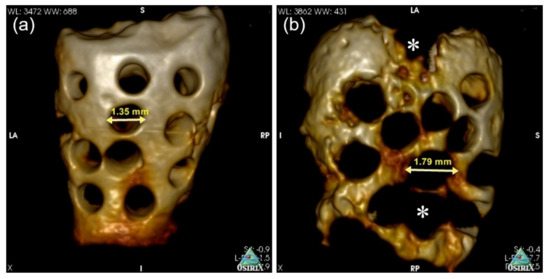 The structural integrity of the PR-DDM was lost especially in the middle and lower portions at 4 months due to higher levels of dentin absorption (Figure 4b). A significant number of custom-made macro-pores disappeared at 4 months compared with the initial study time and 2 months (* p < 0.05) (Table 1). The macro-pores became significantly wider at 4 months compared to before the graft (* p < 0.05), indicating advanced dentin absorption (Figure 5) (Table 1). The 3D micro-CT images highlighted the higher quantity of absorbed scaffold at 2 months compared to that at 4 months (Figure 4 and Figure 5).