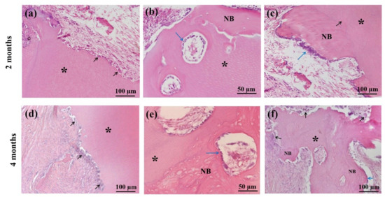 Histological evaluation of sheep iliac defects at 2 months (a–c) and 4 months (d–f) with hematoxylin and eosin (HE) staining. (a) Cellular phagocytosis of PR-DDM (asterisk) by multinucleated giant cells (black arrows), (b) New bone induction (NB) with regular osteoblast layer (arrow) by PR-DDM (asterisk), (c) Well-demarcated boundary (arrow) observed between PR-DDM (asterisk) and new bone (NB); note: osteoblast layer (blue arrow) on new bone, (d) Cellular absorption of PR-DDM (asterisk) by the higher number of multinucleated giant cells (black arrows), (e) New bone (NB) with mosaic-like structure induced by PR-DDM, (f) Simultaneous evidence of new bone formation (NB) with osteoblasts (blue arrow) and PR-DDM bio-absorption (asterisk) by multinucleated giant cells (black arrows).