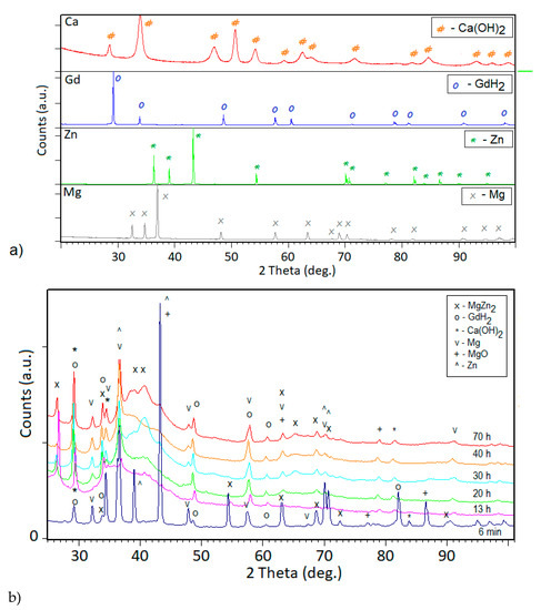 The X-ray diffraction patterns obtained for (a) Ca, Gd, Zn, Mg initial powders; (b) Mg65Zn30Ca4Gd1 powder alloy samples synthesized after 6 min, 13, 20, 30, 40, and 70 h of milling time, respectively. The most important peaks of main identified phases are labeled according to the ICDD PDF4+ 2016 data base (MgZn2, 03-065-0120; GdH2, 01-089-4063; Ca(OH)2, 00-004-0733; Mg, 00-001-1141; MgO, 00-003-0998; Zn, 03-065-3358).